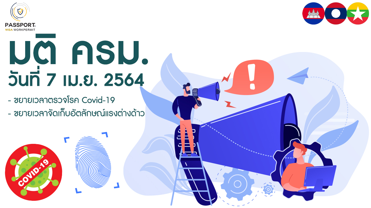 2.1 กระทรวงแรงงาน ออกประกาศปรับปรุงแก้ไข ประกาศกระทรวงแรงงาน เรื่อง การอนุญาตให้คนต่างด้าวทำงานในราชอาณาจักรเป็นการเฉพาะ สำหรับคนต่างด้าวสัญชาติกัมพูชา ลาว และเมียนมา ภายใต้สถานการณ์การแพร่ระบาดของโรคติดเชื้อไวรัสโคโรนา 2019 ตามมติคณะรัฐมนตรี เมื่อวันที่ 26 มกราคม 2564 ลงวันที่ 11 กุมภาพันธ์ พ.ศ. 2564 เพื่อให้คนต่างด้าวดำเนินการตรวจหาเชื้อไวรัสโคโรนา 2019 และจัดเก็บอัตลักษณ์บุคคล (Biometrics) ได้ถึงวันที่ 16 มิถุนายน พ.ศ. 2564 และให้คนต่างด้าวที่ได้รับอนุญาตทำงานไปจัดทำหรือปรับปรุงทะเบียนประวัติคนซึ่งไม่มีสัญชาติไทยที่มีใบอนุญาตทำงานอยู่ด้านหลังของบัตรได้ถึงวันที่ 31 มีนาคม พ.ศ. 2565 รวมถึงการอนุญาตให้คนต่างด้าวทำงาน ตามแนวทางที่กรมการจัดหางานกำหนด