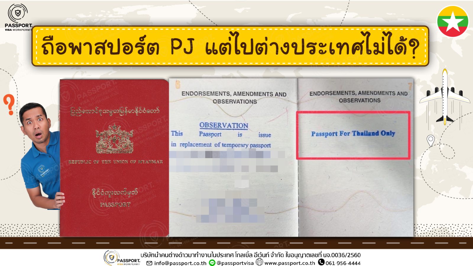 PJ ที่มีตราประทับ Thailand Only ไม่สามารถใช้ยื่นขอวีซ่าหรือเดินทางไปเกาหลี ญี่ปุ่น หรือประเทศอื่นได้ ต้องติดต่อสถานทูตเมียนมาเพื่อหาแนวทางออกเอกสารใหม่ที่ไม่มีข้อจำกัด กรุณาปรึกษาผู้เชี่ยวชาญก่อนตัดสินใจ
